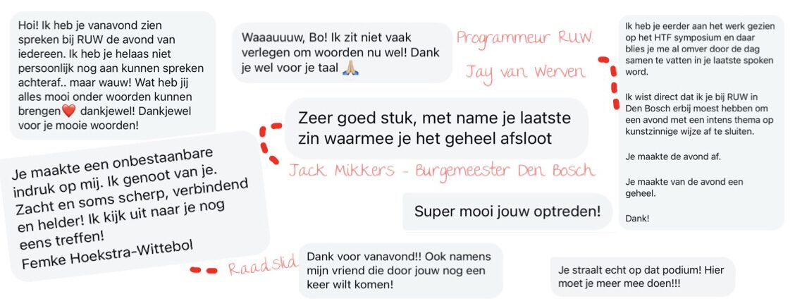 Ik word ingezet bij festivals, symposia, stadsgebeurtenissen en bedrijfsevenementen om dagen te openen, te verbinden of af te sluiten met een poëtische wrap-up: een voordracht die ter plekke ontstaat en de dag in woorden samenvat.